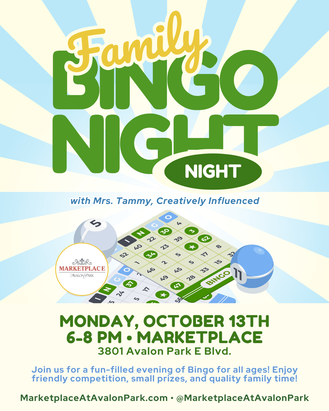 Join Mrs. Tammy for Family Bingo Night at the Marketplace! There will be fun for all ages & small prizes for the kids! Come play.