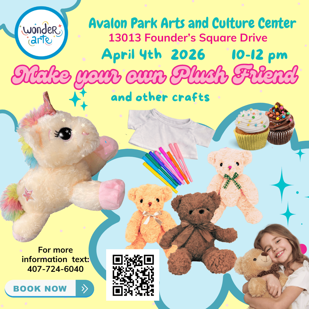 Join us for a magical and creative experience at Wonder Arte! During this special event, children will choose between an adorable unicorn or bear plush, bring it to life, and make it extra special by designing a custom T-shirt for their plushie.